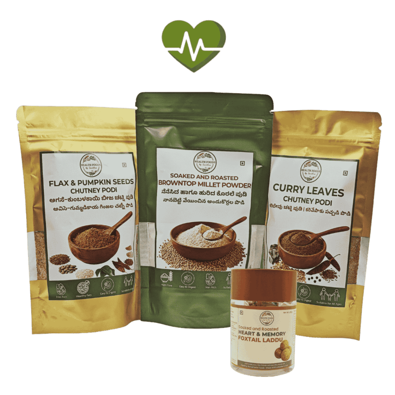 (Includes: Flax & Pumpkin Seeds Chutney Podi - 150g, Curry Leaves Chutney Podi - 150g, Soaked & Roasted Browntop Millet Powder - 250g and Soaked and Roasted Heart & Memory Foxtail Laddu - 215g)