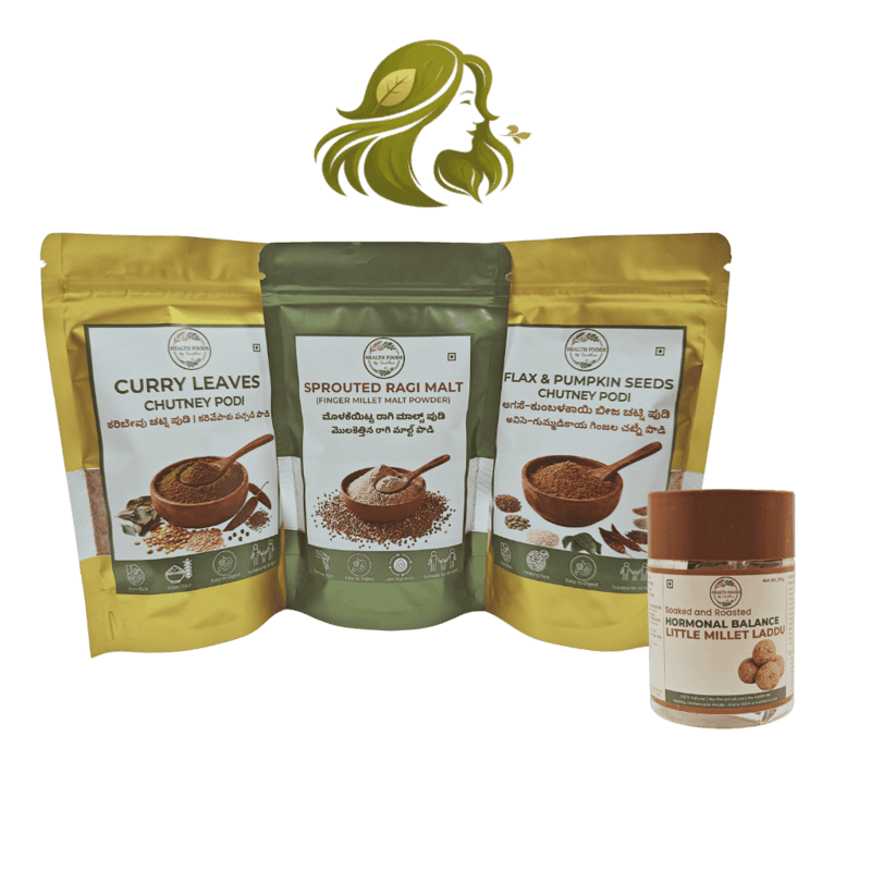 (Includes: Soaked and Roasted Hormonal Balance Little Millet Laddu - 215g, Curry Leaves Chutney Podi - 150g, Sprouted Finger Millet (Ragi) Malt Powder - 250g, Flax & Pumpkin Seeds Chutney Podi - 150g)